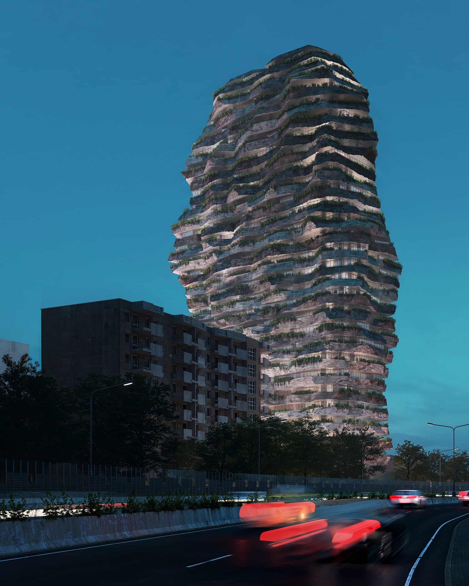 The tower is conceived as a “great urban rock” rising from Tirana’s ring road – a natural-like form that embodies both solidity and the dynamism of a rapidly evolving capital.