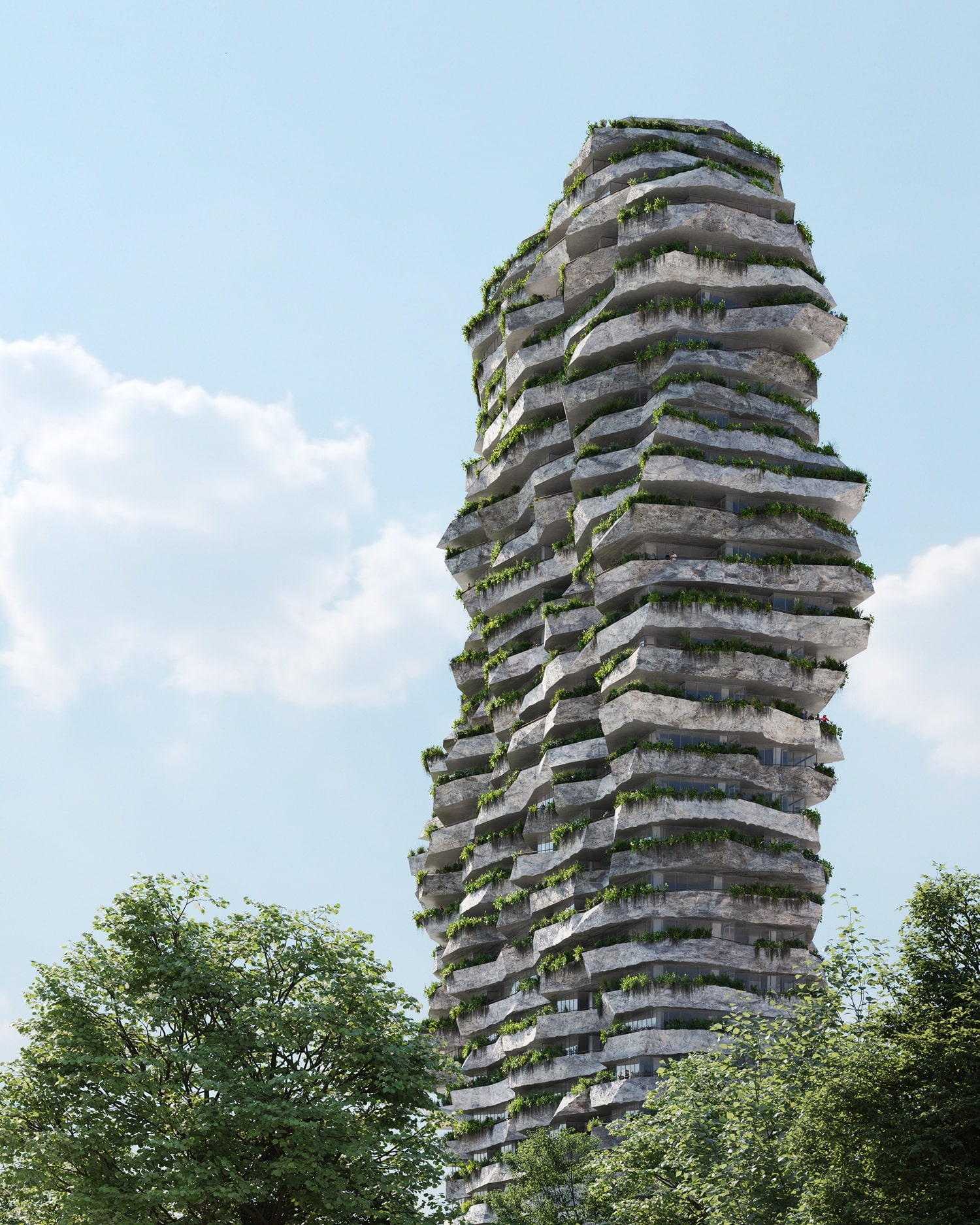 The structure is envisioned as a vertical monument, combining modern aesthetics with urban functionality.